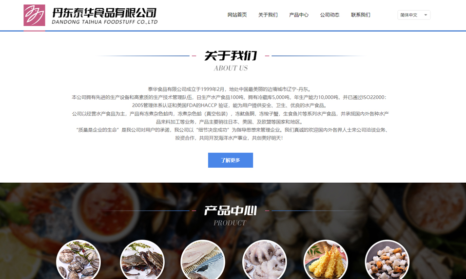 泰華食品有限公司成立于1999年2月,地處中國最美麗的邊境城市遼寧-丹東。本公司擁有先進的生 產(chǎn)設(shè)備和高素質(zhì)的生產(chǎn)技術(shù)管理隊伍,日生產(chǎn)水產(chǎn)食品100噸,擁有冷藏庫5,000噸,年生產(chǎn)能力10,000噸,并已通過ISO22000:2005管 理體系認證和美國FDA的HACCP 驗證,能為用戶提供安全、衛(wèi)生、優(yōu)良的水產(chǎn)食品。