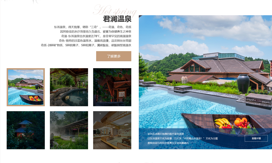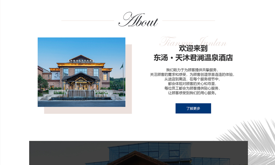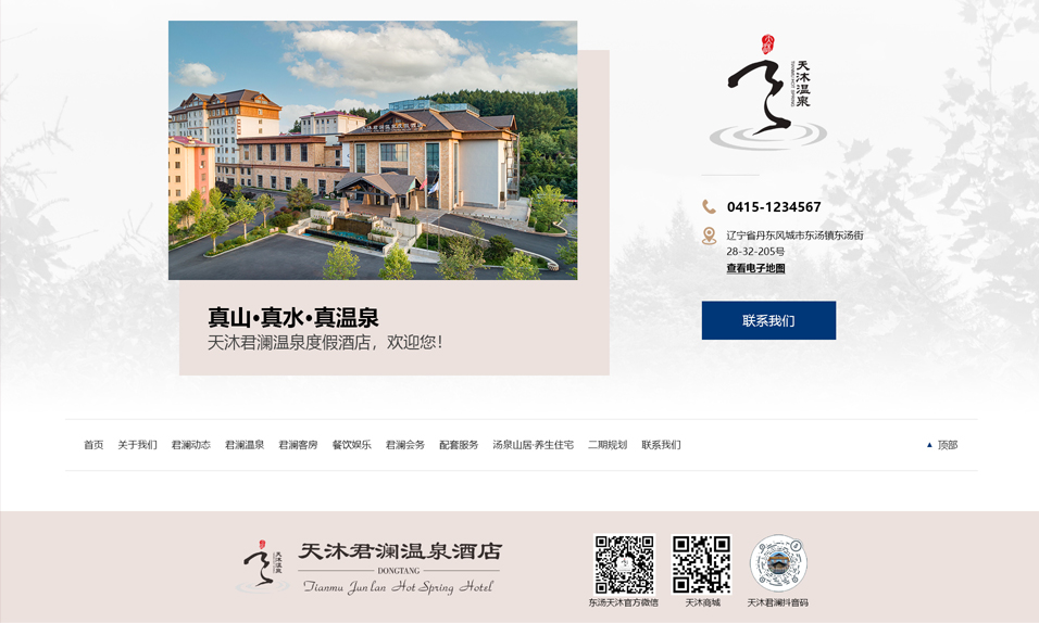 東湯天沐君瀾溫泉度假酒店位于遼寧省千年溫泉文化名城——東湯鎮(zhèn),是丹東市寶達(dá)房地產(chǎn)開發(fā)有限公司投資興建的一家集溫泉養(yǎng)生、酒店住宿、特色餐飲、休閑娛樂、商務(wù)會(huì)議于一體的綜合型溫泉度假酒店??傉嫉孛娣e 5 萬平米,周邊青山環(huán)繞、鳥語花香,環(huán)境極為愜意、自然。